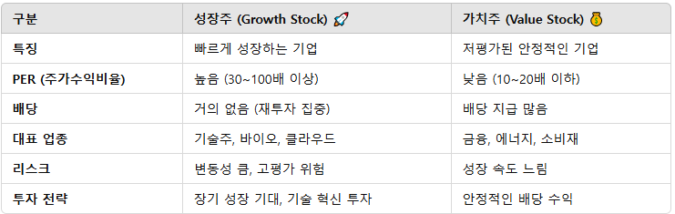 🔹 성장주 → 미래 가치 상승 기대 / 가치주 → 배당 & 안정적 수익